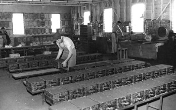 It was then sprinkled with rose-headed water cans, and 'turned' again by shovel on the floor till it was evenly dampened through out with no lumps. This was known as 'conditioning', and varied according to circumstances.