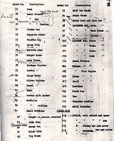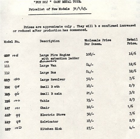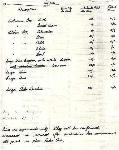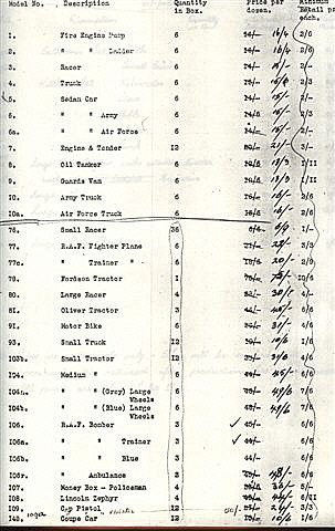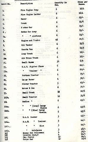 Illustrated is copy of the 1942 price lists, showing the first date 20/2/1942, the list commencing with the Lead slush-moulded toys, Nos. 1-10, (insufficient stocks had not been reached since the fire, hence the remark - "Not in Production."