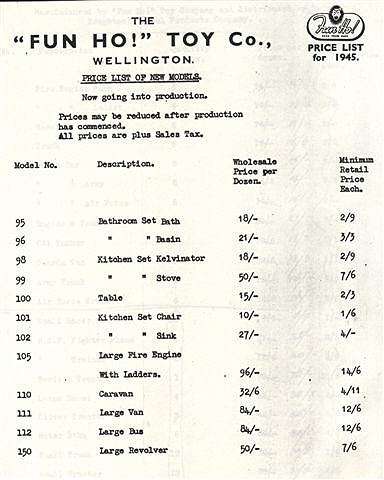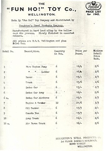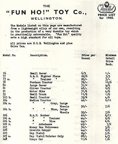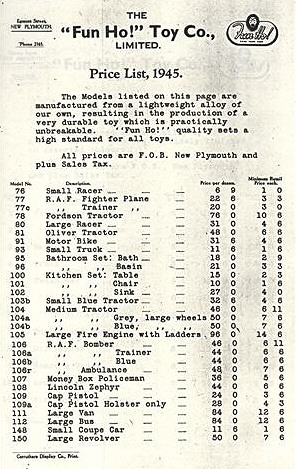Since the restructuring and subsequence cessation of Fun Ho! Toys, much research has been done, sifting through old records, castings, and price lists. Some 'mysteries' are still unsolved, but this could be the time to report on 'progress.' It has been recorded in several reports down the years that there was a fire in the (Fun Ho!) Factory in the early days, which destroyed all early records and presumably most Lead Toys in Stock prior to 1941.