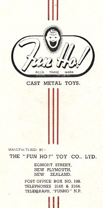 The ubiquitous Fun Ho! trade mark was no doubt used for some time before it was officially registered and gazetted in 1940, as there were a lot of "Registration applied for" stickers on earlier Fun Ho! Toys to support this belief.