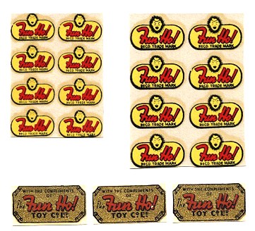 A transfer with the same original gold background is shown on a scroll "with the compliments of the Fun Ho! Toy Company Ltd." The fact that it never became necessary to revert to yellow, in the case, may indicate that more toys were given away in the early days!