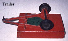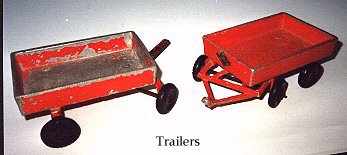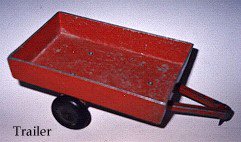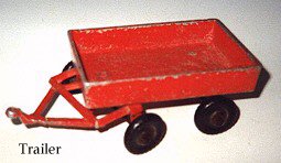 Some had cast aluminium drawbars, but latterly most drawbars were 3/16" diameter rod cast into the body and bent at the end. The wheels were 1 3/4" diameter black rubber on 3/16" axles for both two and four wheelers.