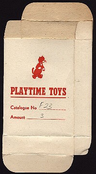 By far most were supplied in dozens or half dozens, or fewer still if the particular models were larger in size. These small cartons were 100x75x19mm. Both these sizes of plain cartons were marked with a rubber stamp with "PLAYTIME TOYS - Catalogue No....." and "Amount."