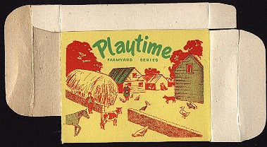 The smaller size carton was also used with a Walking Cat Logo and the same legend as above, usually done in printer's ink. These same small cartons had yet another variation with an attractive little farmyard scene, printed in red and green, all on a bright yellow background. The words "PLAYTIME farmyard series" was printed in green.