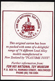 In all of the four sections, there are a number of models which are superfluous to the only known catalogue. A full collection of the manufacturer's lead products are to be seen on display in the Fun Ho! National Toy Museum, Inglewood, New Zealand.