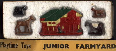 Of special interest is the "Junior Farmyard Set," which consisted of a semi-flat (German house, with four miniature animals, usually a cow, horse, sheep and goat. These five models were embedded into a flat block of expanded polystyrene (180x70x22mm) which was contained around the edge by a strip of cardboard, printed with "Playtime Toys Junior Farmyard Set." The whole package was then wrapped in light clear cellophane and sello-taped into position.